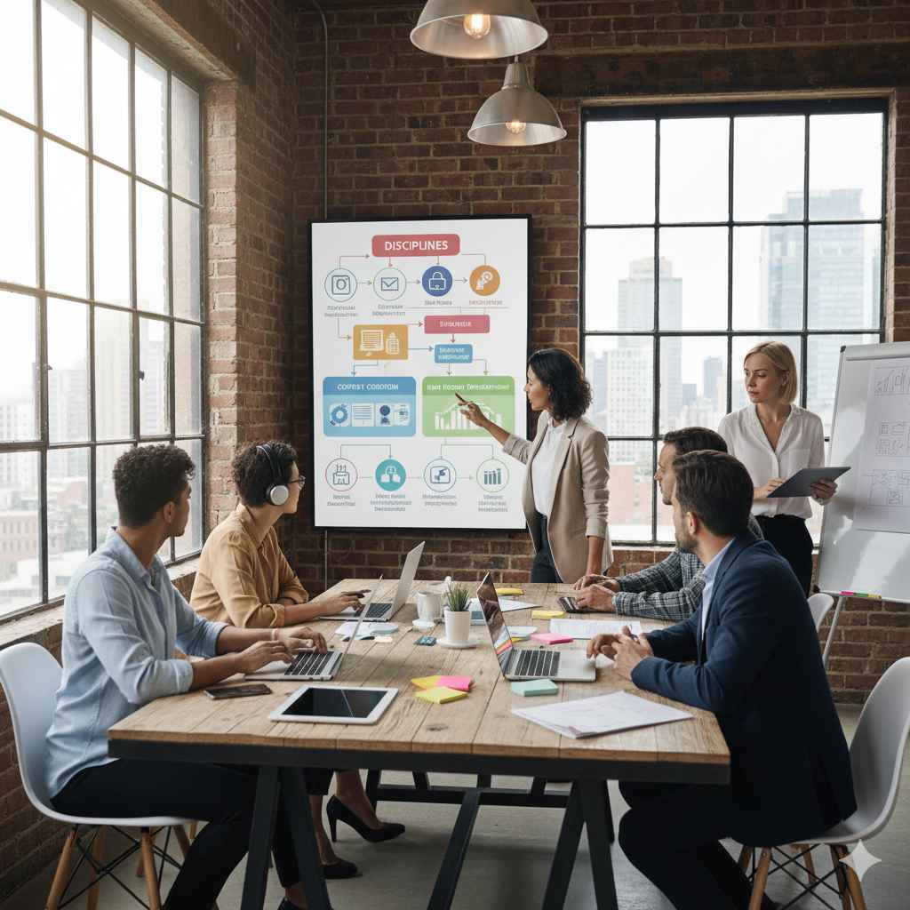 צוות של חברת שיווק בדיון אסטרטגי סביב שולחן עבודה פתוח